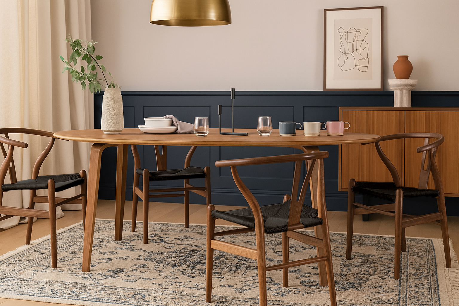 Experience the enduring charm of the Wish Chair in rich Walnut with a striking black seat. Defined by its clean lines and sculpted backrest, this classic design balances strength and elegance. The contrast of dark wood and woven seat creates a statement piece, perfect for dining areas or professional settings.
