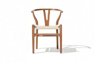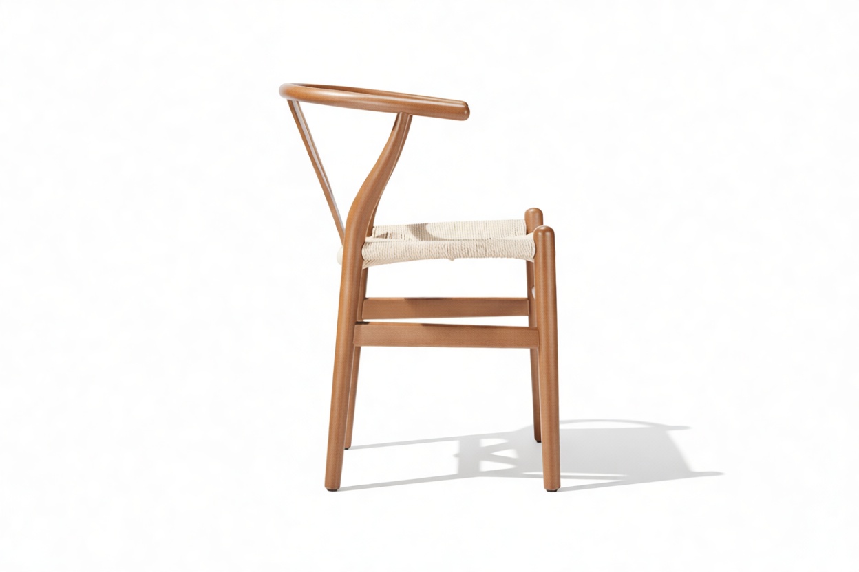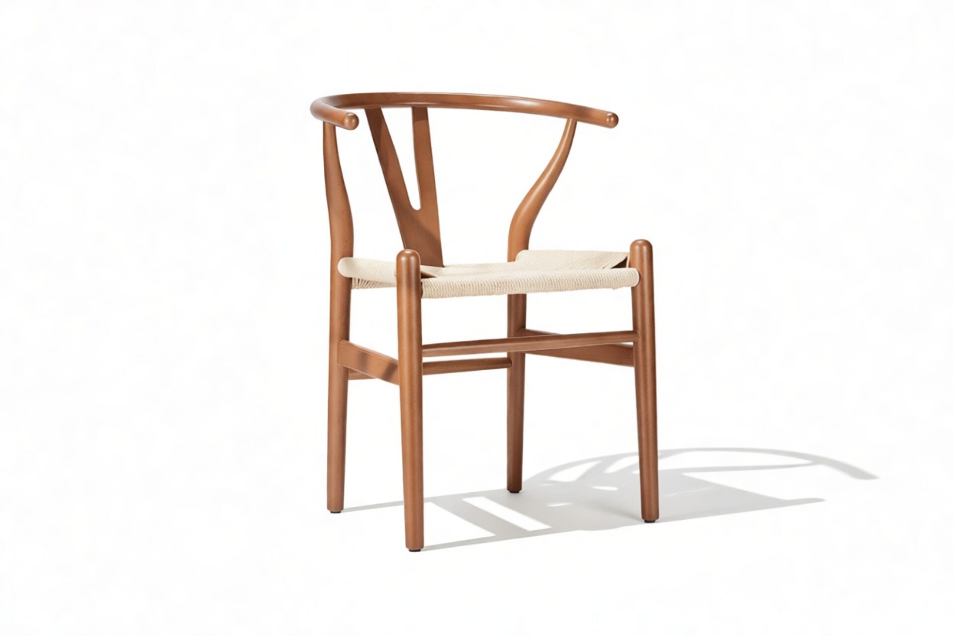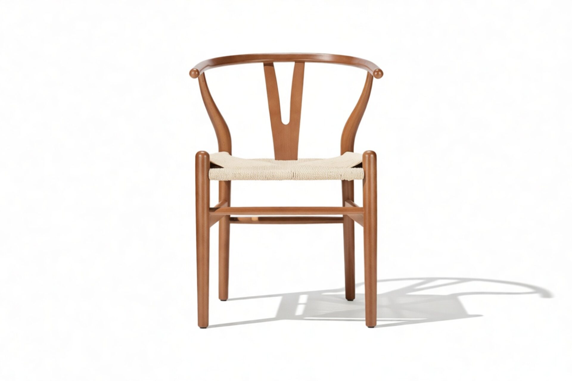 The Wish Chair, inspired by world-renowned Wishbone chair, exemplifies the iconic mid-century Danish design known for its unique back-rest support shape. This chair's design represents a superb example of elegant simplicity. Featuring curved back legs that gradually taper to connect with the back rail, its silhouette continues to captivate enthusiasts of the design. The Wish Chair is a minimalist's dream, boasting a lightweight yet sturdy and sophisticated frame paired with a comfortable paper-cord seat.